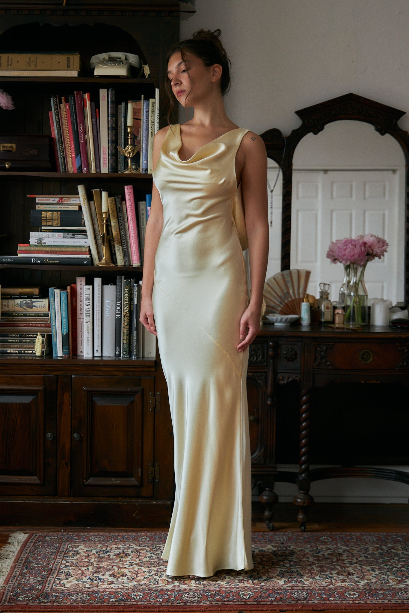 Plunging Back Cowl Dress in Butter - XXS (PETITE) (PREORDER) is backordered and will ship as soon as it is back in stock.