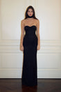 - Made and Designed in New York. Strapless stretch gown with collar. Silicon Gripper along neckline. Invisible zipper with hook and eye center back. Comes with removable power mesh lining. Also available in Diamond Sand.